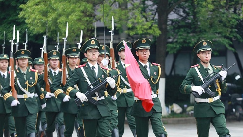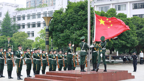 6:50升旗仪式正式开始。国旗护卫队的同学迈着铿锵有力的步伐,护送国旗入场。伴随着高亢、激昂的《义勇军进行曲》,鲜艳的五星红旗冉冉升起,全体师生齐唱国歌、行注目礼。歌毕,同学们挥舞着鲜红的国旗,表达对祖国无限的热爱和崇高的敬意。
