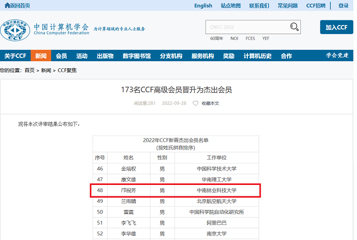 2022928日,中国计算机学会官网发布《173CCF高级会员晋升为杰出会员》名单,2022年中国计算机学会(CCF)杰出会员评审工作已顺利结束,共有173名高级会员晋升为杰出会员,我院副院长、CCF YOCSEF长沙2022-2023主席、新一代通信网络与大数据研究中心主任邝祝芳教授名列其中,CCF评审委员会高度评价了邝祝芳教授的专业造诣和长期以来对CCF发展的贡献。