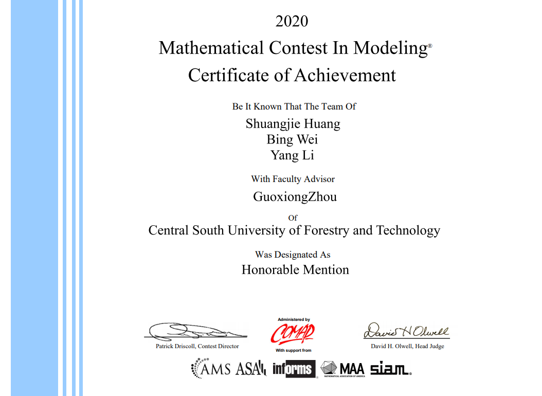 我院共17位学生(占全校1/3)榜上有名,分别获得特等奖提名奖(Finalist Winner)5人次,一等奖(Meritorious)2人次,二等奖(Honorable)10人次,创造近年来最好成绩。其中何明芳博士指导的团队获得特等奖提名奖,取得了我院学生参加美国大学生数学建模竞赛以来的最好成绩。