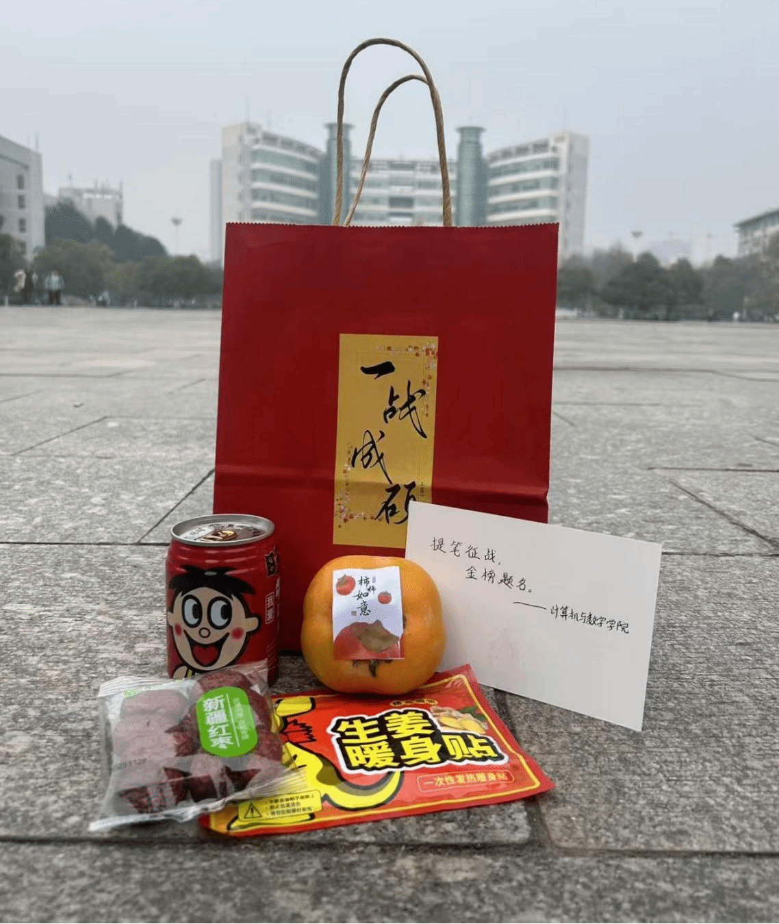 在图书馆、自习室门口,老师们亲手递上福袋,与学子亲切交流,关切询问其身心健康,分享冲刺阶段备考技巧,叮嘱大家科学规划时间、注重劳逸结合,以平稳心态迎战考研。同学们接过福袋笑意满满,纷纷表示这份关怀驱散了备考的疲惫,增添了底气。