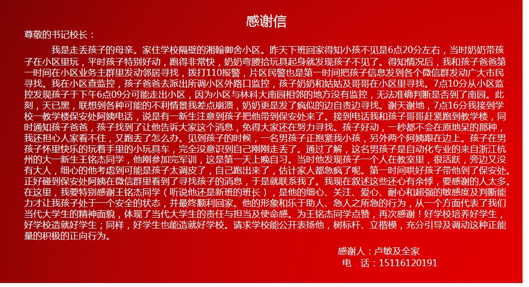 9月27日晚上,来自计算机与信息工程学院2021级自动化2班的王铭杰同学,在第一天去上晚自习的路上,在树人楼四楼发现了一个落单的小男孩,他马上意识到不妥,决定带小男孩去寻找保安帮助。王铭杰通过保安室的电话,联系上了巡逻保安,在多方协助下,找到了小男孩的妈妈。