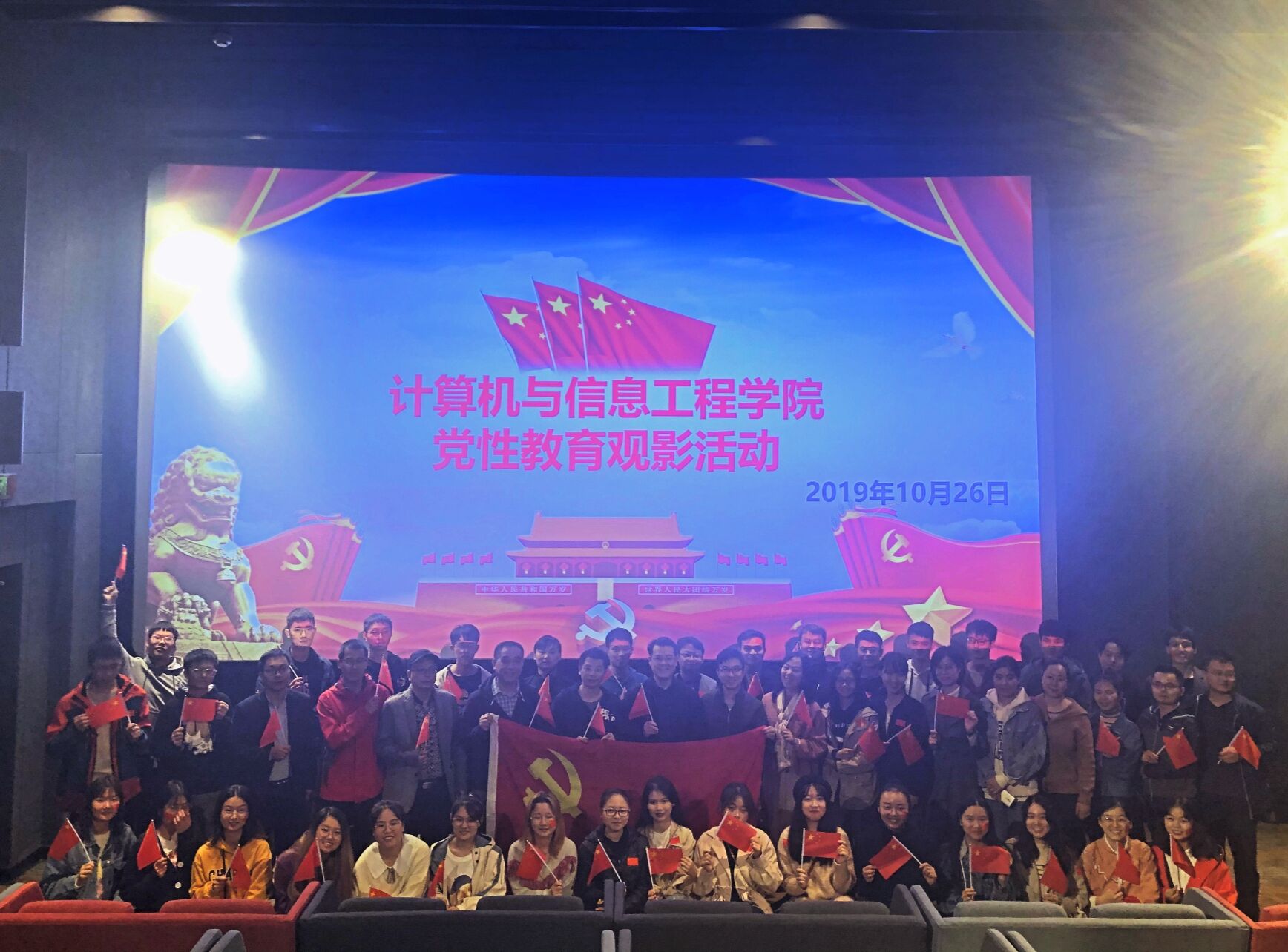 为扎实推进“不忘初心,牢记使命”主题教育,弘扬爱国主义精神。2019年10月26日上午,计算机与信息工程学院全体党支部在万影汇城举行的《我和我的祖国》观影活动,教职工党员和学生党员齐聚影院,用深情告白祖国。