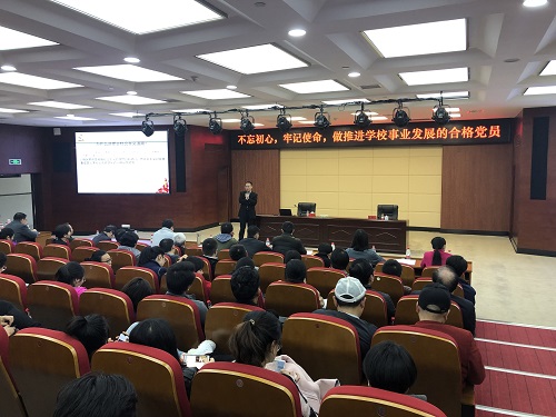 王忠伟从中国共产党的初心、党的发展历程到习近平新时代中国特色社会主义思想以及怎样做推进学校事业发展的合格党员三个方面进行了诠释。深刻回答了我们作为高校党员如何做推进学校事业发展的先锋战士。他要求大家一要不忘初心,牢记使命。作为一名党员,无论是从事教学、科研,还是管理工作,永远不要忘了从哪里来,走到了哪里,要到哪里去;二要认真学习贯彻习近平新时代中国特色社会主义思想和十九大精神,要把这个作为当前和今后一个时期的首要政治任务。作为一名高校的党员,我们要深刻理解和把握“九个坚持”,深刻领会重要论述的重大意义。结合学校实际、自身的岗位要求,以对党负责的态度去做好本职工作,共同为学校提升办学水平和人才培养质量贡献力量;三要坚持四个回归,教育学生的天职就是努力读书;教师回归“教书育人”的本分;后勤服务人员回归“服务人才培养”的本分;管理人员要回归“管理育人”的本分。最后希望全校党员干部要勤于思考、敢于负责、勇于担当、善于作为,以教育大会精神指导本单位、本部门工作,找准弱项,补齐短板,切实做到有实招、见实效。