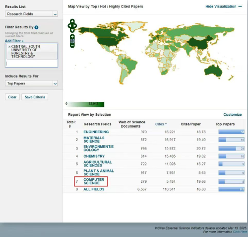 本期数据显示,我校计算机科学相关论文共发表279篇(其中热点论文1篇,高被引论文8篇)、总被引频次5484次,篇均被引次数19.66,学科全国排名155名,全球排名850名。