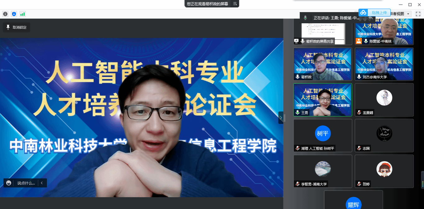 4月30日上午,计算机与信息工程学院通过腾讯会议以线上方式召开了人工智能本科专业人才培养方案专家论证会。论证会专家组由湖南省人工智能学会教育工作委员会主任委员、湖南大学机器人学院常务副院长李智勇教授,省人工智能学会教育工作委员会副主任委员、教育部青年长江学者、中南大学自动化学院人工智能系主任王勇教授,省人工智能学会教育工作委员会常务委员、南华大学计算机学院副院长刘杰教授,省人工智能学会教育工作委员会常务委员、湖南农业大学人工智能专业负责人陈义明副教授等专家组成。我校教务处副处长王文磊教授、计算机与信息工程学院教学副院长陈爱斌教授、人工智能专业负责人易积政副教授及部分专业教师参加了会议,湖南理工学院人工智能教研室主任孙树平博士、湖南第一师范学院人工智能专业负责人谭志国副研究员、湘南学院人工智能专业负责人刘耀辉副院长等列席了会议。会议由陈爱斌主持。