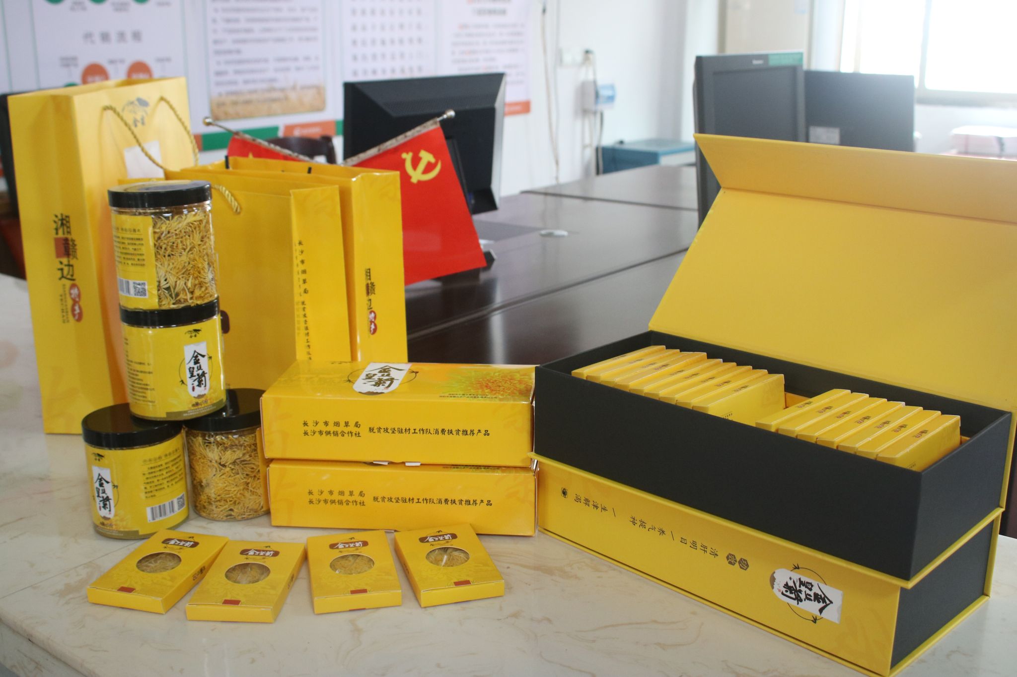 随后,工作人员黎春华女士向我们展示了金丝黄菊的产品实物,详细介绍了金丝黄菊的优势及特点,以及其生产包装方式和线上、线下销售模式。使用微信小程序 “赞品汇”,便可搜索到当地生产的金丝黄菊并进行线上购买,同时希望对茶叶感兴趣的各位社会人士能够支持他们的金丝黄菊产业,为石霜村的扶贫项目贡献出自己的一份绵薄之力。相信在国家的相关扶贫攻坚政策的带领下,金丝黄菊当前的商业规模和营销渠道能得到进一步的改进,石霜村的金丝黄菊产业必定会得到更好的发展。
