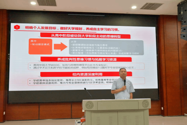 会议伊始,焦建军院长代表学院对新生表示热烈欢迎。随后,他全面介绍了学院发展历程、师资力量、人才培养体系及特色优势等。在职业规划与就业指导方面,焦院长进行了重点阐述,并针对如何度过有意义的大学生活提出了四点建议:一是明确发展目标,科学制定规划;二是夯实专业基础,积极参与实践;三是增强团队协作,提升综合素质;四是注重体育锻炼,保持身心健康。