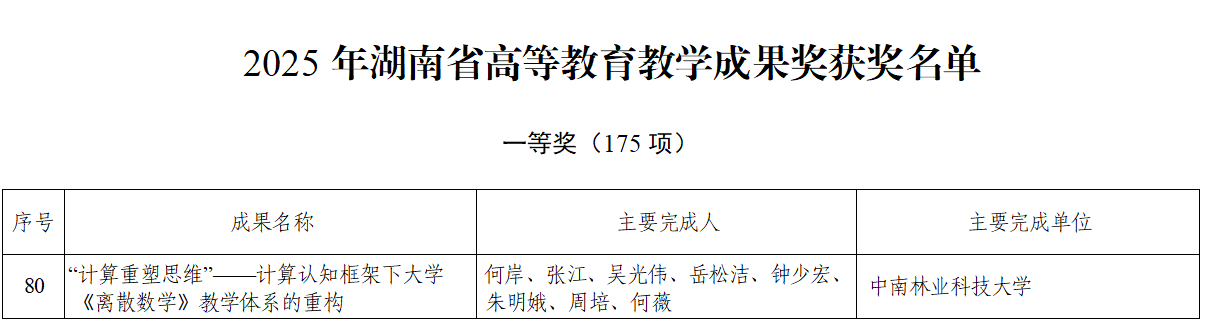 近日,湖南省教育厅公布了2025年湖南省高等教育教学成果奖获奖名单,我院何岸老师牵头申报的”’计算重塑思维’——计算认知框架下大学 《离散数学》教学体系的重构”荣获湖南省高等教育教学成果一等奖。